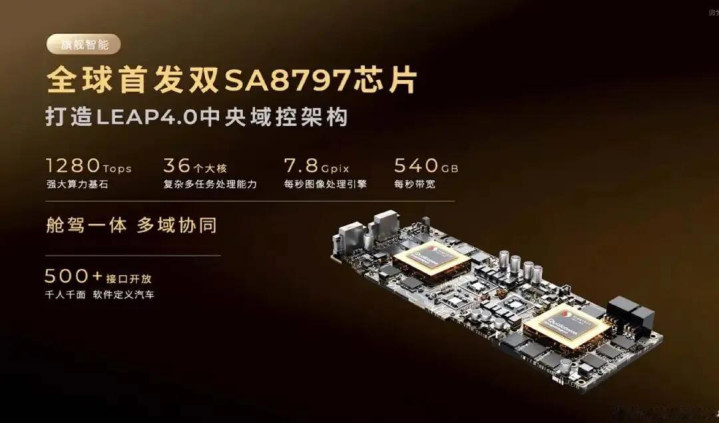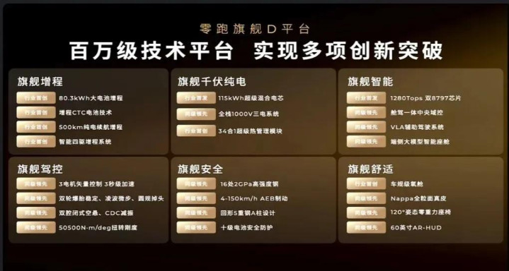 内饰及舒适配置方面,零跑D19搭载车规级森野氧舱、60英寸AR-HUD,配备Nappa全粒面真皮材质的 120° 姿态零重力座椅。智能化层面,新车全球首发高通骁龙双8797芯片,算力达1280Tops,拥有36个大核,构建LEAP4.0中央域控架构,实现舱驾一体、多域协同,开放 500 + 接口;同时搭载 VLA 辅助驾驶系统与端侧大模型智能座舱。