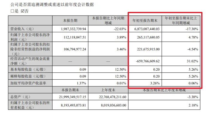 全筑股份前三季度营业收入为6.64亿元,同比增长13.80%;归母净利润为-8999.27万元,同比下降161.57%;扣非归母净利润为-6904.46万元,同比下降27.10%。按单季度看,全筑股份第三季度营业收入为2.13亿元,同比增长44.47%,第三季度利润总额为-1818万元,同比增长38.67%。