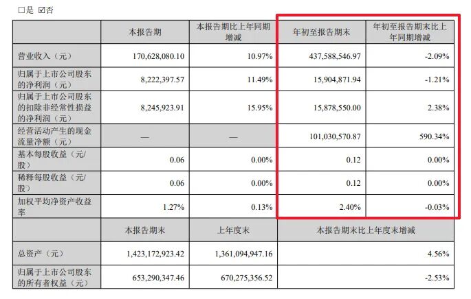 名雕股份2025年前三季度实现营业总收入4.38亿元,同比下降2.09%;归母净利润1590.49万元,同比下降1.21%;扣非净利润1587.86万元,同比增长2.38%;经营活动产生的现金流量净额为1.01亿元,同比增长590.34%。按单季度数据看,第三季度营业总收入1.71亿元,同比上升10.97%,第三季度归母净利润822.24万元,同比上升11.49%。